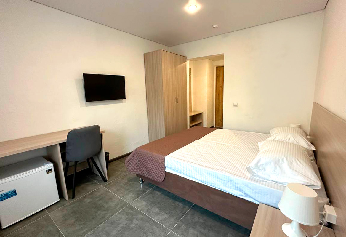 Площадь номера - 12 - 16 кв.м. Возможно размещение 2-х человек на основных местах + 1 дополнительное место (кресло-кровать или евро-раскладушка).. В номере: душ, туалет, ТВ, холодильник, кондиционер, фен, двуспальная или две раздельные кровати, балкон.